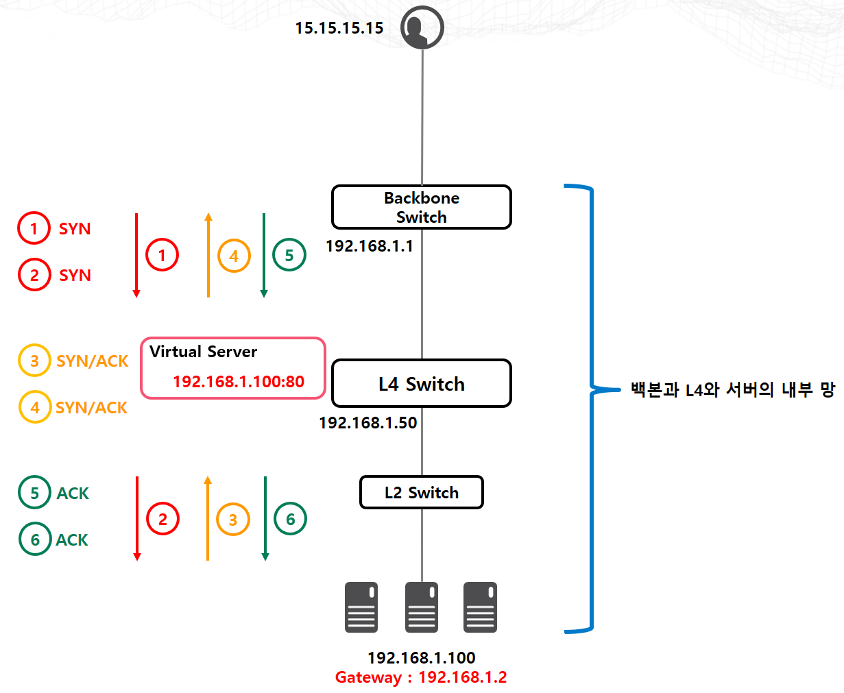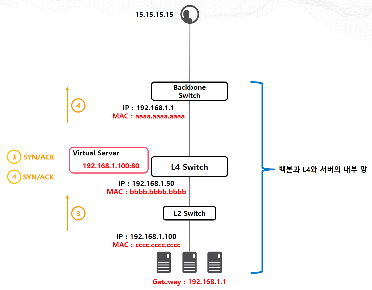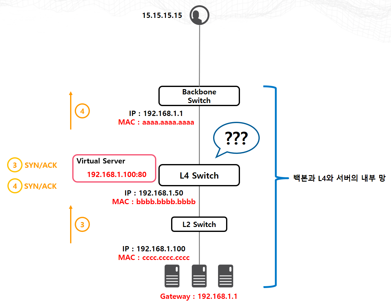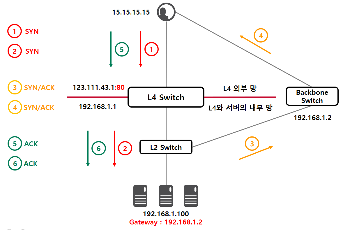 L4 스위치가 직접 Packet을 처리하기 위해서는 Packet의 목적지 정보(IP or MAC)가 L4 스위치를 가리키고 있어야 합니다. 다시 말하면 위의 상황에서는 이 Packet이 SYN/ACK Packet이라는 것을 모르는 상태에서 그저 전달만 했다는 겁니다. 그리고 SYN/ACK Packet을 받아든 사용자는 다시 ACK Packet을 L4 스위치로 보낼 것이고, L4 스위치는 아직 SYN/ACK Packet을 받지 못했다고 생각할 것 입니다. 그리고 당연히 다음 반응을 보이며 이 Packet을 드랍시키겠지요.