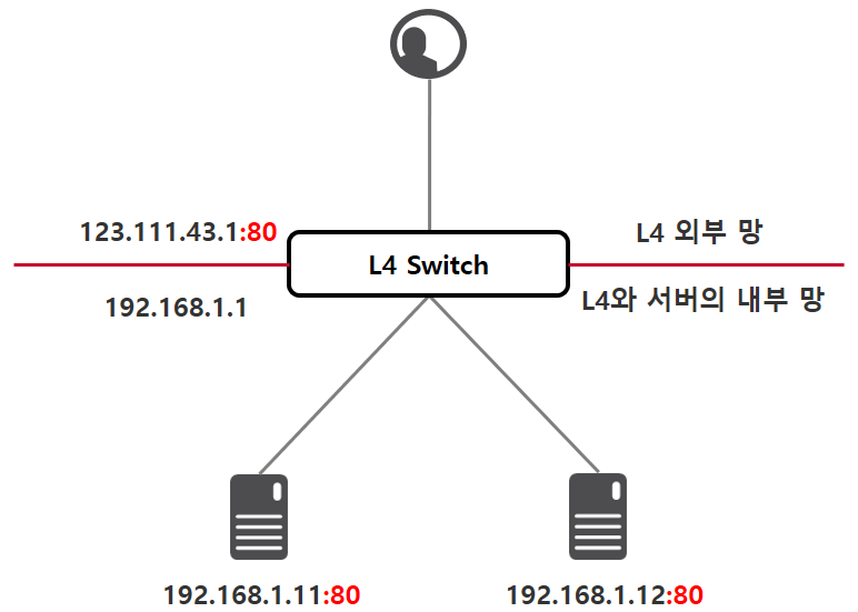 사용자의 요청이 L4 스위치로 향할 때 목적지의 포트는 L4 스위치의 Virtual Server의 서비스 포트인 80으로 설정됩니다.