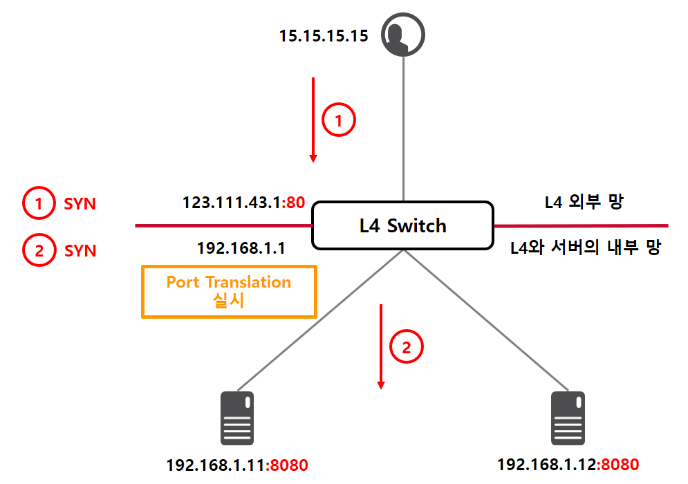 ① 출발지 : 사용자(IP 15.15.15.15) - > 목적지 : L4 스위치(IP 123.111.43.1:80)