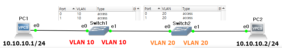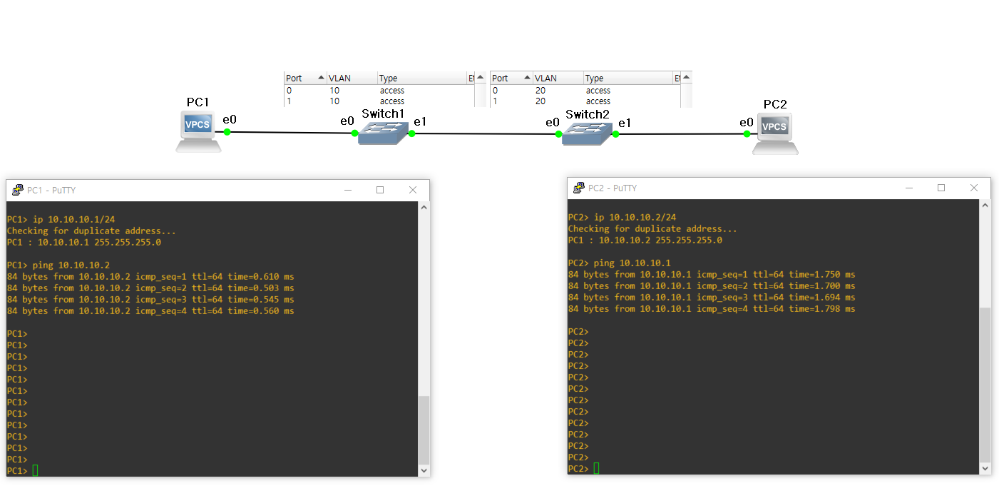 위 그림을 보시면 두 개의 스위치를 두고 양쪽 끝단에 PC 2대가 있습니다. 그리고 Subnet Mask는 동일하지요. 그런데 각각의 스위치는 액세스 포트에 설정된 VLAN이 다릅니다. 왼쪽의 스위치는 두 개의 액세스 포트에 VLAN 10을, 오른쪽의 스위치는 두 개의 액세스 포트에 VLAN 20을 설정했습니다. 이 상태에서 양쪽 끝단의 PC는 서로 ICMP Check(Ping)를 할 수 있을까요?