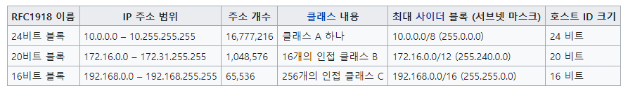 인터넷의 성장은 IPv4 Address(이하 IP 주소)의 폭발적인 수요를 불러왔고 이는 근심거리가 아닐 수 없었습니다. 43억 개에 달하는 IPv4의 숫자는 적은 것은 아니지만 수요 증가세를 볼 때 그리 많은 숫자도 아니었기 때문입니다. 그리하여 탄생한 것이 바로 사설망(Private Network)입니다. IPv4의 대역 중 일부를 Private IP(이하 사설 IP)로 지정하여 가정, 기업, 기관 등 근거리 통신망(Local Area Network, 이하 LAN)에서 사용하도록 한 것입니다. 사설 IP는 다음 표에 잘 나와있지요.
