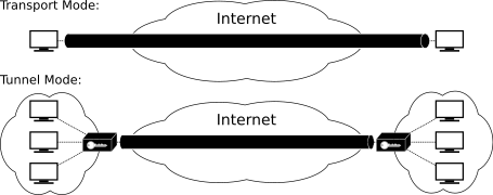 또한 IPSec에는 Transport Mode와 Tunnel Mode로 나뉘는 운용 모드라는 것이 존재하는데 단말에서 단말로 직접 터널을 연결할 것인지, VPN을 양쪽 네트워크에 두고 VPN 간 터널을 연결할 것인지를 결정하고 운용하는 기능입니다. 전자를 Transport Mode(이하 전송 모드) 후자를 Tunnel Mode(이하 터널 모드)라고 부릅니다. 아래 그림에서 잘 표현하고 있지요.