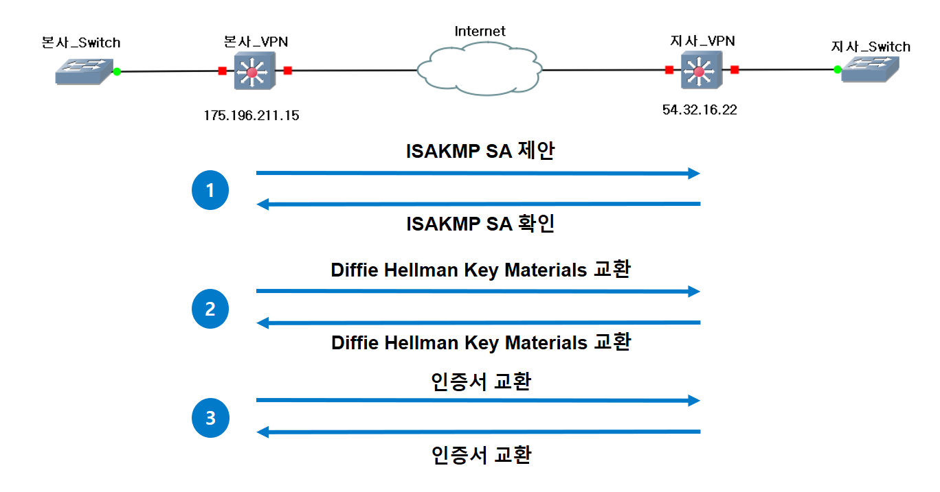 1. VPN간 안전한 Phase 2 SA 교환을 위한 Phase 1 터널 생성과 상대방(Peer VPN) 인증(IKE Phase 1, ISAKMP SA)
