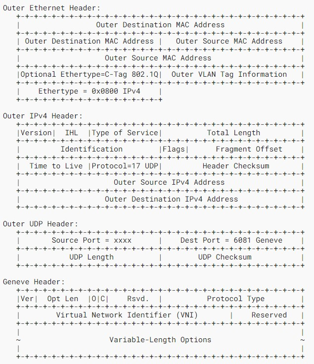 - GENEVE Protocol은 Generic Network Virtualization Encapsulation의 약자로 VXLAN과 같은 역할을 하는 캡슐화 프로토콜이며 UDP 6081 포트를 사용하여 이더넷 프레임을 캡슐화함(VXLAN은 UDP 4789 포트를 사용)