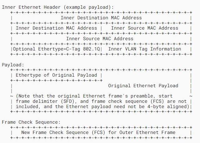 - VLAN(4096개 각각) 내부에 또 다른 VLAN 4096개를 생성하는 방법을 사용하여 사용 가능한 VLAN 개수를 비약적으로 늘려 최대 1600만 개의 VLAN을 사용할 수 있음