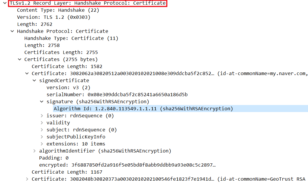 또한 Client는 데이터 암호화에 사용할 대칭키(비밀키)를 생성한 후 SSL 인증서 내부에 들어 있던 (Server가 발행한) 공개키를 이용해 암호화하여 Server에게 전송할 것입니다. 아래를 보면 SSL 인증서가 무슨 알고리즘(RSA)으로 암호화되었고, 무슨 Hash 알고리즘(SHA256)으로 서명되었는지 확인 가능합니다.