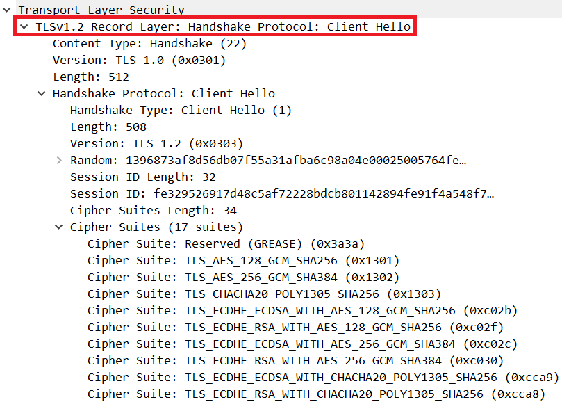 Client가 Server에 연결을 시도하며 전송하는 패킷입니다. 자신이 사용 가능한 Cipher Suite 목록, Session ID, SSL Protocol Version, Random byte 등을 전달합니다. Cipher Suite는 SSL Protocol version, 인증서 검증, 데이터 암호화 프로토콜, Hash 방식 등의 정보를 담고 있는 존재로 선택된 Cipher Suite의 알고리즘에 따라 데이터를 암호화하게 됩니다. 아래 사진을 보면 Client가 사용 가능한 Cipher Suite를 Server에 제공하는 것을 알 수 있습니다.