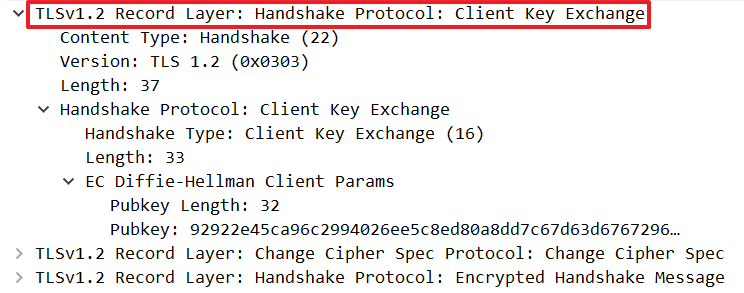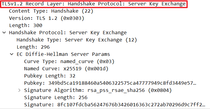 위의 경우, 키 교환 알고리즘이 Diffie-Hellman(DH, DHE 등) 알고리즘이기에 키 교환 재료를 서로 교환하므로 'Server Key Exchange'를 발생시키는 것입니다. 아래 'Client Key Exchange'에서 자세히 설명합니다.