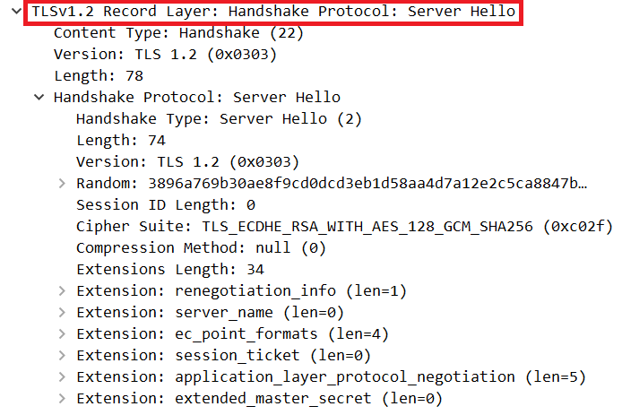 Client가 보내온 ClientHello Packet을 받아 Cipher Suite 중 하나를 선택한 다음 Client에게 이를 알립니다. 또한 자신의 SSL Protocol Version 등도 같이 보냅니다. 아래 사진을 보면 ClientHello에서 17개였던 Cipher Suite와 달리 아래에서는 Server가 선택한 한 줄(Cipher Suite: TLS_ECDHE_RSA_WITH_AES_128_GCM_SHA256)만이 존재하는 것을 알 수 있습니다. Client가 보낸 리스트에 있는 Cipher Suite 중에 한 개를 선택한 것이지요.