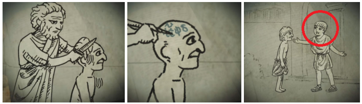 그 당시로서는 정말 획기적인 방법이 아닌가 싶습니다. 누가 두피에 글을 적어서 보낼 거라고 예상을 할까요? 물론 머리가 다 자라라면 한참 걸린다는 단점이 존재하지만 들키지 않는 데는 이만한 방법이 없는 것 같습니다. 그만큼 중요한 정보를 안전하게 보내는 것이 가장 중요했기 때문이겠지요. 세 번째 그림에서 보니 동그라미 속 수신자는 반가운 얼굴로 사자를 맞이하네요. 그게 의미하는 것이 뭘까요? 바로 수신자와 송신자가 전달방법에 대해 이미 공유하고 있으며, 사자가 온 이유를 알고 있다는 뜻입니다.
