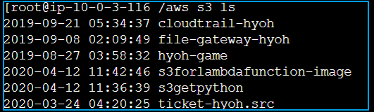 Gateway endpoint를 설정하고 난 후의 경로 변화입니다. 일단 아무것도 안 뜨는군요; 아마존 백본 네트워크는 경로를 보여주지 않는 것일까요? NAT Gateway로 나간 흔적이 보이지 않는 것을 보니 일단 외부인터넷은 타지 않고 있습니다. 기능이 제대로 되는지 확인하기 위해 'aws s3 ls' 명령어를 통해 S3 Bucket list를 불러왔습니다.
