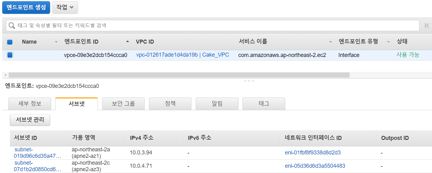 또한 'Private DNS names enabled'를 반드시 활성화해야 합니다. 그렇지 않으면 DNS가 Endpoint network interface의 주소가 아닌 공인 IP 주소를 불러오게 됩니다.