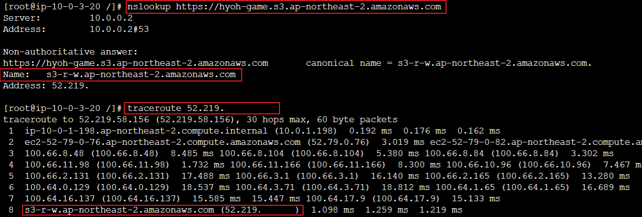 'Traceroute' 명령어를 통해 확인해 보면 Private Subnet의 EC2가 NAT Gateway(10.0.1.198)를 거쳐 Internet Gateway에서 52.79.0.76의 공인 IP로 Source IP NAT되어 외부 인터넷으로 나아가 52.219.x.x IP를 갖는 S3 bucket에 도착함을 알 수 있습니다.