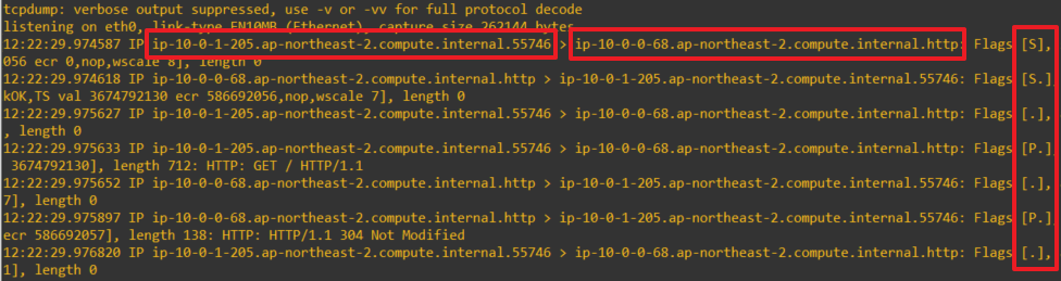 그리고 ALB(10.0.1.205, ip-10-0-1-205.ap-northeast-2.compute,internal.55746)는 자신이 부하 분산할 대상그룹과 EC2 인스턴스(10.0.0.68, ip-10-0-0-68.ap-northeast-2.compute.internal.http)를 정하겠죠. 그다음에 ALB는 VPC 내 자신의 사설 IP를 활용하여 EC2 인스턴스와 3-way handshake를 실시합니다. 이것이 두 번째 동작입니다. 아래 그림을 통해 확인하실 수 있습니다.