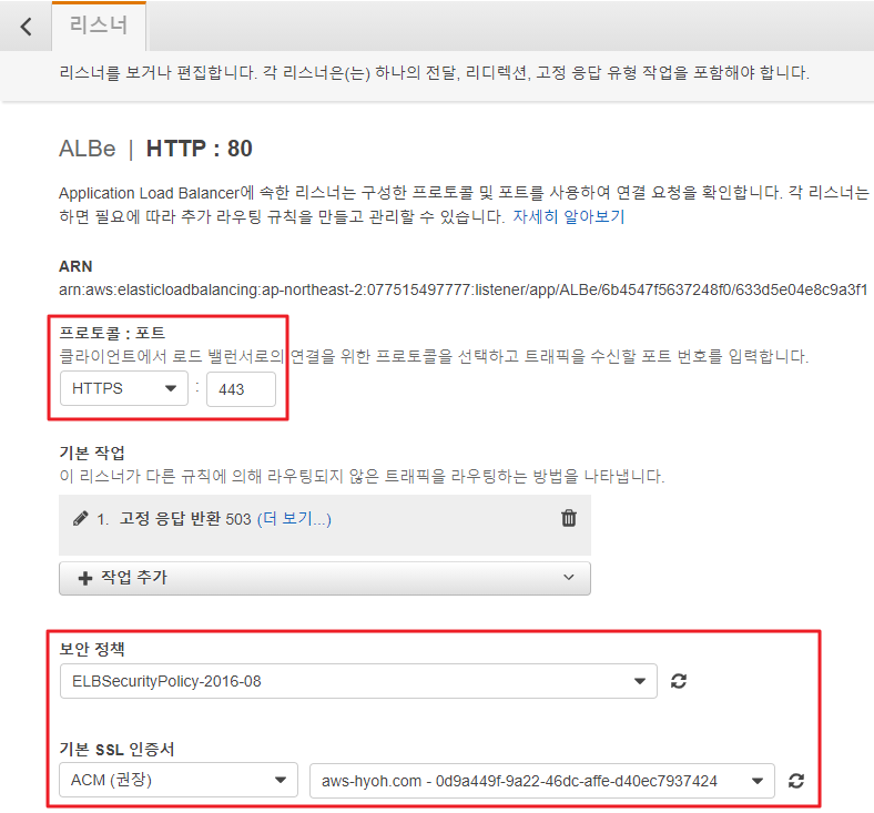 (설정 화면 : EC2 인스턴스 - 로드밸런서 - 리스너 - 리스너 편집)