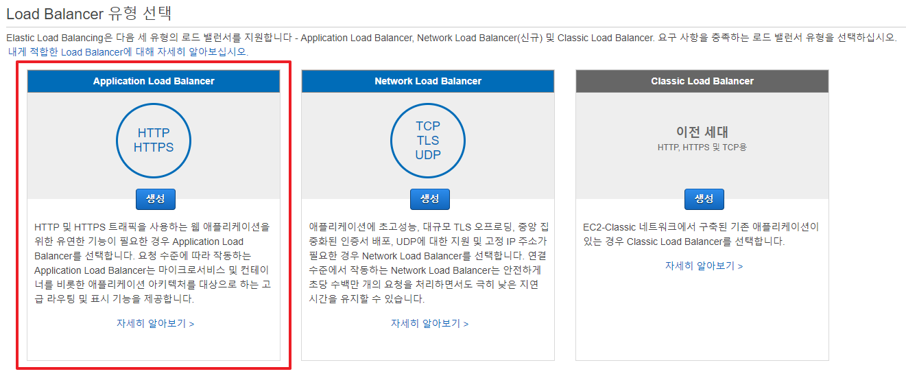 Application Load Balancer(이하 ALB)는 AWS에서 제공하는 4가지 로드밸런서 중 하나로 OSI 7 Layer에서 일곱 번째 계층에 해당하는 Application Layer를 다루는 로드밸런서입니다. 왜 이름이 Application Load Balancer인지 감이 오시지요? 그렇지만 위에서 설명했던 수많은 프로토콜의 Profile이 적용되는 L7 Virtual Server를 사용하는 L4 스위치와는 달리 HTTP와 HTTPS, WebSocket을 활용하는 로드밸런서라는 것이 가장 큰 특징입니다. 아래 그림은 로드밸런서의 선택 화면인데요, 빨간색 박스가 ALB입니다. HTTP와 HTTPS 트래픽을 사용하는 웹 애플리케이션을 위한 로드밸런서임을 설명하고 있죠.