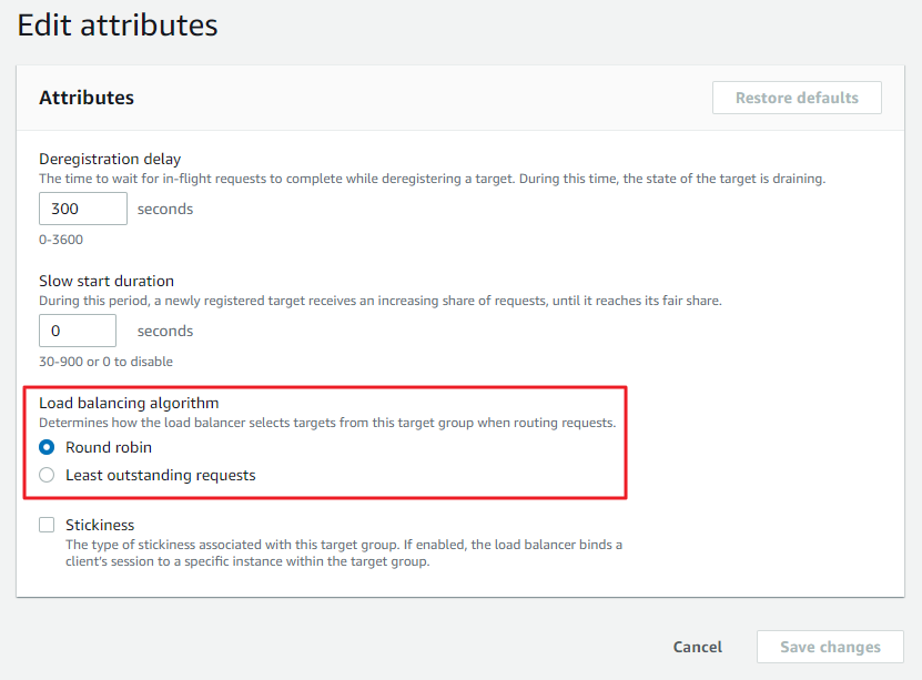 (설정 화면 : EC2 서비스 - 로드밸런서 - 대상그룹 - 그룹 상세 - 속성 - 로드밸런싱 알고리즘)