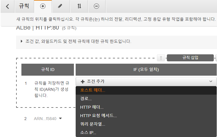 (설정 화면 : EC2 서비스 - 로드밸런서 - 리스너 - 규칙 - ALB 규칙 보기/편집 - '+' 버튼 - 규칙 삽입)